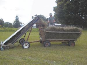 Hay loader: In the past Gies and his four children hand-loaded loose hay. With only one “hired hand” at home last year, he got serious about creating a hayloader. After trying and failing with a prototype made mostly with scrap materials, he invested in an 18-ft. long, 4-ft. wide hay inverter belt and about 500 nylon teeth. The first set-up didn’t work, so Gies reversed the direction and put the hay loader in front of the wagon. He reversed the direction of the teeth and added tin to the top to hold the hay. The drive belts were twisted to reverse the driving direction, and Gies built the rollers out of 5-in. thin-wall pipe and cold-rolled 3/4-in. rod.