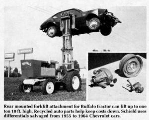 His new Buffalo tractors come in 16 to 25 hp models, all of them made mostly from used auto parts. The differential, for example, is a Chevrolet. "Chevrolet differentials used between 1955 and 1964 were practically indestructible, and most of them far outlived the cars that housed them. There are thousands, probably millions, of them lying around in perfectly useable condition. And, they will probably again outlast any machine in which they are installed."