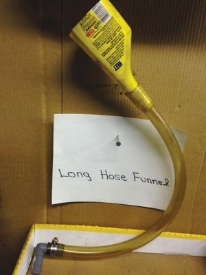 Long Hose Funnel Pours Oil Into Hard-To-Reach Vehicle Transmission FARM SHOP Handy Hints Ron Paustian Eau Claire Mich : “I put together this long hose funnel to pour oil into hard-to-reach vehicle transmissions I cut the bottom off a 1-pint plastic fuel additive container and turned it upside down then friction-fitted one end of a transparent hose to it A 90-degree pvc elbow is clamped onto the other end of the hose and reaches into the transmission I used a heat gun to heat up the hose so that it would stretch and fit over the funnel Once the hose cools down it locks itself on ”