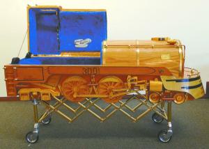 The inside included real gauges and train parts and a window at the head of the coffin. The outside replicated a New York Central 3001 steam locomotive engine that was built in 1940.