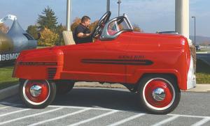 He kept the interior simple like the original pedal car - including placing the steering wheel in the center. He uses an oversize steering wheel in parades and at shows, but has a second, normal-size steering wheel for driving on the highway. The 5-in. wide by 36-in. tires designed for antique cars fit the car’s scale. Hryhorcoff adjusted the rear end ratio to compensate for the larger tire diameter.