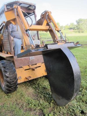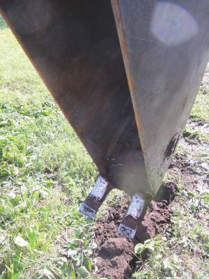 The trencher consists of a 6-in. wide rounded bucket made from 1/4-in. thick carbide steel, which is welded onto a quick-tach mounting plate. The bottom part of the trencher is open and has a pair of carbide steel teeth spaced 6 in. apart welded onto it.