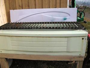 He started with a 5-ft. long, 32-in. wide tub. He cut up a 1-in. angle iron bed frame and welded it together at the corners to make a frame, which friction fits to the top of the bathtub. He used a 14-in. abrasive chopsaw to cut a series of 3/16-in. wide, 1/2-in. deep slots into the frame, spacing them 2 in. apart. Then he cut up an old bandsaw blade into 18-in. lengths and inserted them - cutting edges down, into the slots to form the table’s working surface.