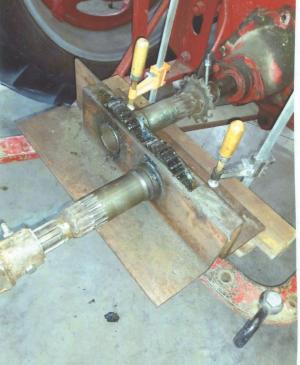 A direct connection would result in the second tractor shaft turning the wrong way. His reverser uses two gears left over from live power units in older IH tractors. Eddy lined up the gears and sandwiched them between 1/4-in., 4 by 5-in. angle iron.