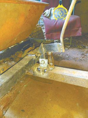 A 1/4-in. thick, horizontal metal strap that’s free to pivot is welded to the trip lever and is beveled at one end, which rests on a small metal tab welded to the frame. The main part of the strap rides on a 6-in. long compression spring that’s welded to the tongue. Pulling the trip lever forward compresses the spring and causes the strap to pull away from the frame, which causes the bucket to dump. When Henson lets go of the lever, the bucket drops back down, and the strap automatically resets itself.