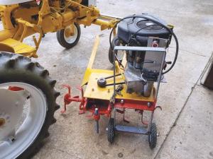 Walk Behind Rototiller Belly Mounted On Farmall Cub Tractor FARM HOME Miscellaneous I reworked an old 1960’s Sears walk-behind rototiller so I could belly-mount it on my 1972 Farmall Cub tractor It mounts on a separate home-built steel frame that pins onto the tractor The frame bolts to a specially designed 2-wheeled dolly for quick installation and easy storage The 36-in wide rototiller is belt-driven by the 17 hp gas engine off an old riding mower I stripped the rototiller down to the engine gearbox and tines The frame they attach to is equipped with a pair of steel arms that extend up to the front axle and are free to pivot up or down on hinged brackets A short length of chain connects the back of the frame to a lift arm on the tractor To attach the rototiller to the tractor I park it next to the tractor and connect up the front and rear I can start and stop the engine and also adjust its speed right from the tractor Homemade battery cables lead from the rototiller engine to the tractor’s battery under the seat The engine’s fuel line hooks up to the tractor’s gas tank and the throttle cable is independent of the tractor’s throttle It runs smooth and strong Everything on it is simple but it took a lot of trial and error to get it to work just right My son and grandson helped me build it I came up with the idea because I wanted to switch to make 36-in bedded rows in my garden The rototiller tines exactly match the space between the tractor’s rear tires The tiller breaks up the soil and then I pull a set of discs behind on a home-built toolbar that forms the beds Jesse LeBlanc 248 Old Spanish Trail Gibson La 70356; ph 225 287-0679; jesseleblanc33@yahoo com