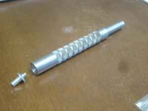 The Dandy Driver comes with a gnurled metal handle, with a long, movable “driving pin” inside that extends out one end of the tool. “You hold the rivet in place with your fingers and use the handle to push the rivet through the skid and backing plate until it’s snug. Then use a hammer to hit the driving pin, which causes the rivet to expand,” says Mills.