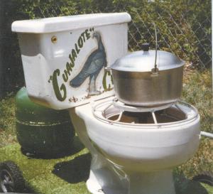You’ve never seen anything like this homemade “commode cooker” that uses a propane burner placed inside a new toilet bowl to cook the food. The water tank behind the bowl, also new, is filled with ice to keep drinks cold.