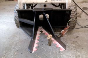 The sawtooth jaws are mounted to a quick-attach plate with the left jaw rigid. The right jaw opens and closes, courtesy of a 2 by 8-in. hydraulic cylinder. The jaw pivots on a 1 1/2-in. pin at the quick attach plate.