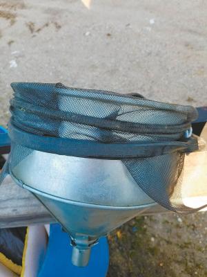 Big Screen Funnel FARM SHOP Miscellaneous Gary Swensen Yankton S Dak : “The little screen in the bottom of a funnel came loose and ended up in the bottom of my fuel tank Instead of throwing the funnel away I made a big screen from some window screen and a tarp strap It goes over the whole top of the funnel It won’t win a beauty contest but it keeps my fuel clean and it won’t fall out of the funnel ”