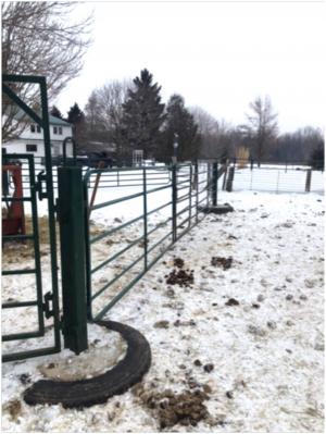 “Tire posts are great for changing the configuration of small paddocks. Using metal gates with the posts makes it easy to adjust the layout to whatever we need,” says Ring. “We use 6-ft. tall , 4-in. square wooden posts treated with pine tar. Since our use is primarily for rotational grazing, the wood makes it easy to use screw-in insulators for running electric fence wire. We can easily scoop two gate posts into the loader bucket to move them around, and we can lift the gates off by hand.”