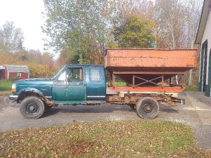 Donnelly already had both the pickup and the gravity wagon. He used a torch to cut off the bed behind the cab and bolted a pair of 6 by 6 wood beams onto the frame. He unbolted the hopper from the gravity wagon and used a loader tractor to set it on the beams, then used the hopper’s original mounting brackets to bolt it on.