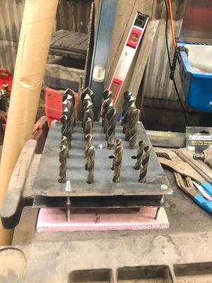 Holder Organizes Tools In Shop FARM SHOP Tools John Matthews Welland Ontario: “My son David enjoys finding ways to organize tools in his shop He made a holder for oversized 1/2-in shank drill bits by drilling through 2 sheets of 14-ga plate that were welded together He drilled 28 holes for the shanks that are 33/64-in wide ground off the welds and used 1/4-in all-thread to separate the plates and to serve as legs There’s a layer of foam at the bottom for bits that don’t have a shoulder ”