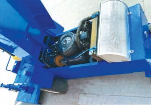 The mower is equipped with 2 hydraulic pumps. One pump powers 3 hydraulic motors mounted on the mower’s 6-ft. deck, and the other powers the machine’s 18-in. front drive wheels.