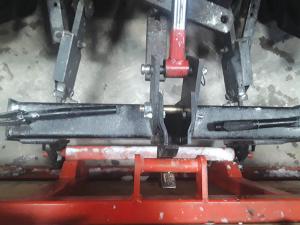 The carrier hooks up to the quick-tach mounting brackets on Wipf’s 3-pt. hitch. He replaced the top link screw on the 3-pt. hitch with a hydraulic cylinder, allowing him to tilt the carrier down to the ground and level with it, without having to get off the tractor. A pair of small steel plates bolt on between the cylinder and the quick tach mounting bracket, extending the stroke of the cylinder to provide an even greater tilt angle.