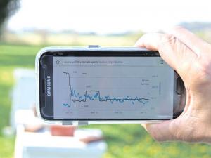 O’Keefe grew interested in bees in the 70s when his brother had 300 hives. As an electrical engineer he started working on his monitoring system about a dozen years ago. It includes a small scale that slips under the corner of a hive and a WiFi module that sends weight and temperature data to a router. In remote situations without WiFi, a hotspot is added.