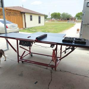 Bond wanted caster wheels under the table for moving it onto his trailer or around his shop. However, he wanted the table to rest on rigid feet when in use or transit. His solution was to have the legs extend past the lower horizontal tubing of the frame. He then hinged a second set of tubing with castor wheels to the insides and parallel to the long sides of the frame.