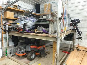 Cory Setcoski has no problem loading his storage rack with snowmobiles, riding mowers or other equipment. Made from a boat hoist, he simply lowers it to the floor, drives the equipment on and raises it back up. Best of all, raising and lowering is all done by hand; no motors needed.