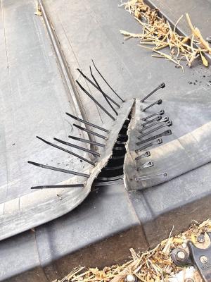 Draper Belt Repaired With Zip Ties COMBINES Maintenance “My farmer engineer degree came in handy today ” proclaimed Jerod Schmidt after executing a creative solution for fixing a broken draper belt on a combine head He drilled holes along the side and used 11 zip ties to create sutures across the tear to hold the sides together It held up until he could get a replacement Contact: FARM SHOW Followup Jerod Schmidt www twitter com/SchmidtJerod