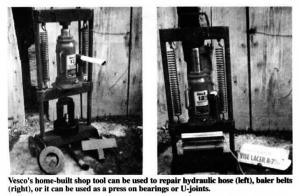 Vesco used 1-in. dia. steel rod to make the sides of the unit and a piece of 1 by 2-in.dia. steel plate to make the top. A pair of steel springs run from the top to a mounting plate that supports a 12-ton jack that's free to slide up or down the rods. There's a table with a hole at center on the bottom of the unit. To use the hose crimper, Vesco feeds the hose up through the hole and into the crimper, then clamps the new end onto the hose and uses the jack to press it on. To use the vice as a belt lacer, he inserts a steel block into the hole and places the belt lacer on top of it.