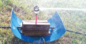 Cadman used 10-in. pieces of 2 by 4’s to sandwich the pipes and PEX couplings as well as to fix them to the skid. Once the sprinkler heads were attached, all that remained was to hook it up to a water source with a flexible hose. The hose made it easy to change sprinkler positions without reconnecting.