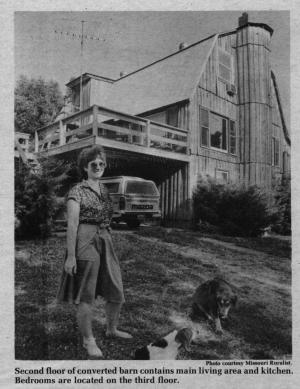 On the second floor is the kitchen and great room, a large area with earth tones. "We wanted to keep it rustic, keep it simple." The Doves used barn siding for the walls, and brick-looking flooring over the oak floor. The room is warm and inviting. Picture windows offer a spectacular view of the valley below. A wood stove sits by one wall, its flue channeled through a silo the Doves built onto the side of their house-barn. The silo looks original.