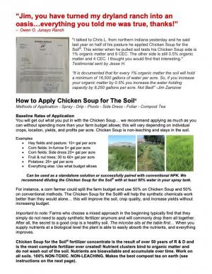 "I talked to Chris L. from northern Indiana yesterday and he said last year on half of his pasture he applied Chicken Soup for the Soil®. This winter when he pulled soil tests his Chicken Soup side is 1% organic matter and 6 CEC. The other side is still 0.5% organic matter and 4 CEC. I thought you would find that interesting." Testimonial sent by Jesse H.