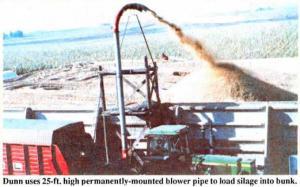 "It eliminates the possibility of tractors and wagons getting stuck in silage, and allows us to build a bunker silo that takes up less space," says Leo Dunn, Clemons, Iowa, who uses a forage blower and a permanently-mounted 25-ft. high blower pipe to fill his bunker silo.