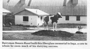 Rand's cow is a fiberglass tribute to Inga, a cow to whom he owes much of his dairying success. "Inga was our first registered Holstein. She 'produced 167,215 lbs. of milk and 7,420 lbs. of fat in her lifetime. Although she died in 1972, 79 of our 110, cows can still be traced one way or another to her," Rand told FARM SHOW. "Some of Inga's offspring, and semen from her male offspring, have been sold throughout the world. One granddaughter was sold to a breeder in Japan for $15,000. So, you can understand why we wanted to do something to perpetuate her memory," says Rand.