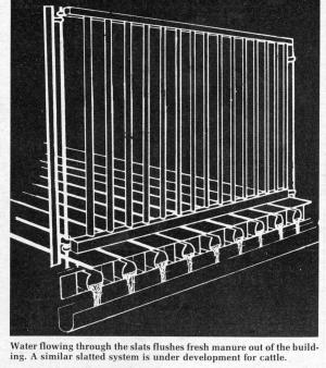 The system requires a slope of 1 in. per 12 ft. of length. "Slightly more slope can be tolerated, but if too much, water will run too fast, causing manure solids to separate out and stay behind," Parks points out. The amount of water flowing through individual slats can be regulated by hand-adjust valves. A 11/z hp. centrifugal pump, costing 6ó per hr. to operate, will circulate the entire amount of water required to flush a 600-hog operation.