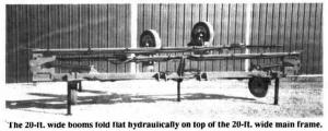 The 20 ft. main frame is made of 5 by 5 by 1/4-in. square tubing. Flat-fold hinges al-low the booms to flex and follow ground contour. Adjustable castor wheels are avail-able on the main frame as an option. Or, the 3-pt. rig can be used as a "suspended boom" without wheels. Boom height for broadcast or band spraying is adjustable from 15 to 30 in. Rear tongue hitch allows a large spray tank and trailer to be towed behind.