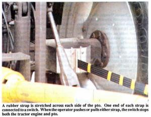 The device, developed by Paul McUrich and electrical contractor Kevin Garrod, consists of two spring-loaded straps that are stretched between the rear of the tractor and the implement, one on either side of the pto shaft. One end of each strap is connected to a switch and protected within a metal box mounted on the tractor's axle. When the operator pushes or pulls either strap, the switch stops both tractor engine and pto shaft.
