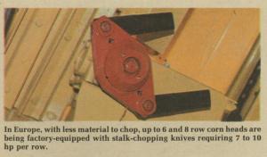 The other manufacturer of chopper-equipped corn heads is the Geringhoff Co., of Ahlen (Westfalia) West Germany. Available throughout Europe for most major brands of combines, it features one twin blade flail-type chopper per row. The stalk choppers, built into the underside of the header, require from 7 to 10 hp per row. Some are made to adjust independent of the header for height of cut, and others raise up and down with the header as it's raised or lowered. Available in 4 to 8 row models, the stalk-chopping feature is built in at the factory and, in most cases, can't be economically retrofitted to existing headers.