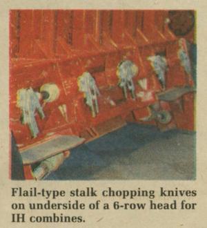 "With a mounting adapter kit, such as the one made by Bish Mfg., Giltner, Neb., our new Claas chopper-headers can be mounted on most makes and models of combines. The flail chopper for each row, and the header itself, adjust independently for height. The stalk-chopping features requires about 7 hp per row and adds about $2,600 to the cost of a 6 row header," according to Brown.