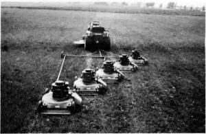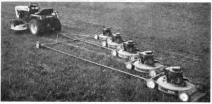5 mower hitch cuts 4 acres/hr FARM HOME Lawn Mowers (31h,38) 13-5-2 You can put together an inexpensive 8-ft. wide mower using five 20-in. push mowers, says Patrick Case, Pioneer, Ohio, who priced wide mowers that cost thousands of dollars before getting the idea of ganging 5 mowers together with a single pull-type hitch.