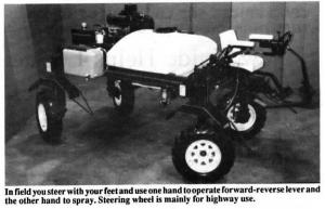 "We didn't spare any expense in building this high-quality machine," says Mark Bruns, sales representative. "It weighs 600 lbs. more than any other 4-wheel steer bean buggy on the market, and the solid frame makes it rigid so it can take lots of abuse. The foot control power steering is for in-field use, and there's a steering wheel for high speed control on the highway. In the field you steer with your feet and use one hand to operate the forward-reverse lever and the other hand to spray. An aircraft throttle allows fine adjustment of speed by turning a knob. The rear wheels track the front ones and oscillate for rough terrain. An optional drop-down step next to the driver's seat makes it easy to get on and off. Once on, you simply reach down and pull up a chain to pull the step up out of the way."
