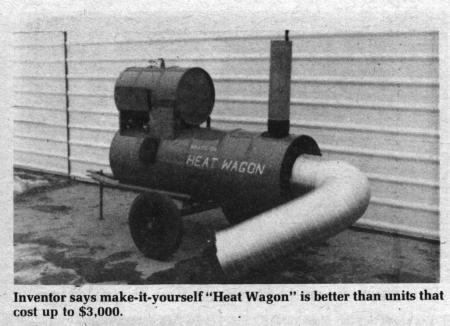 Only moderate preheating of the oil is required for good combustion. A 100-watt light bulb in an enclosed and insulated burner chamber serves this purpose. The Heat Wagon can deliver 150,000 btu per hour consuming 1 gal. of oil per hr.