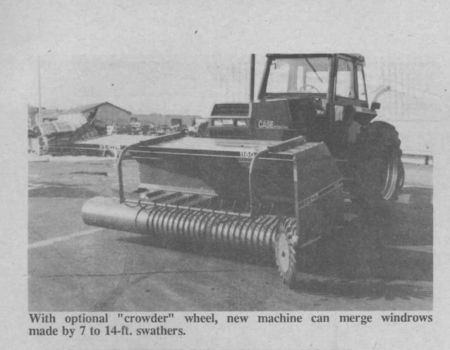 The 10 1/2-ft. wide rig runs entirely off tractor hydraulics. The head, hydraulically adjustable up and down, rides on a large skid and has spring flotation. As you go through the field, the machine's 7-ft. wide hay pickup, picks up the windrow and places it on a 24-in. wide rubber belt. The belt lays the windrow to the side of the tractor. Belt speed is hydraulically adjustable by turning a knob on the bypass valve which allows you to place the windrow in the desired spot. With an optional "crowder" wheel the machine can handle hay from 7 to 14-ft. swathers.