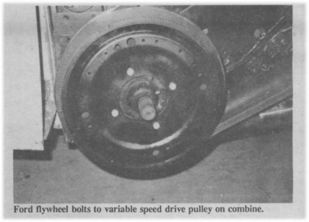 The guts of the reverser is a Ford 428 c.i.d. starter motor and a fly-wheel from a 428 Ford engine (Ball notes that a 390 c.i.d. engine fly-wheel would also work.) The fly-wheel bolts to the variable speed drive pulley on the combine. The starter motor mounts on a steel bracket that bolts to the machine in position to drive the fly-wheel. The starter solenoid mounts under the combine ladder platform and a push-button switch goes inside the cab.