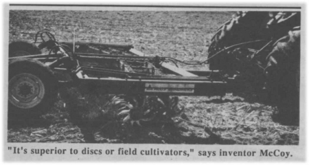 McCoy compares his "Spider Plow" with the way his cows chew their cud. "Cows produce nature's most perfect food by chewing and re-chewing forage into small enough pieces for the bacteria in their rumen to break it down. In the same way, this revolutionary new tillage tool renders crop and animal residue into small enough pieces so soil bacteria can convert it into a form my crops can use. This process must take place in the upper layer of soil where there's enough oxygen to speed decomposition."