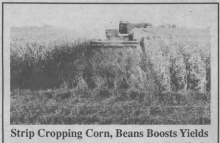 He plants corn and soybeans in alternate 8-row strips (30-in. rows) running north and south. The idea: To expose tall-growing corn to more sunlight by alternating it with rows of low-growing soybeans.