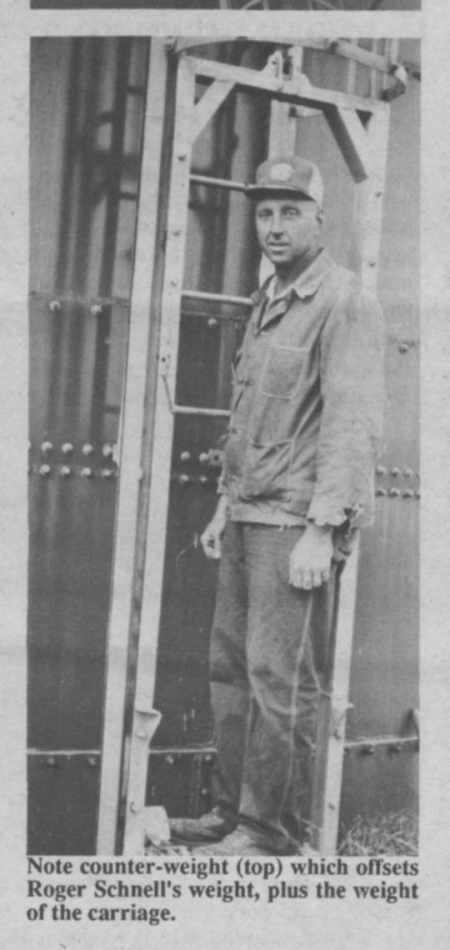 "We load and unload our Harvestore year-around, which adds up to a lot of trips to the top to open and shut the filler door. Hardly a month goes by that we don't make at least one or two trips up and down in the lift. We've used it for 13 years without any mechanical, safety or other problems," says Roger who feels most Harvestores equipped with a conventional ladder would be good candidates for a similar home-built "man mover."