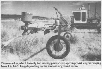 The dispenser, which has only two moving parts, cuts paper in pre-set lengths ranging from 1 to 14 ft. long, depending on the amount of ground surface cover. Spray material is used to weigh down the paper strips, driving them into the ground so they "stay put" even in strong cross winds.
