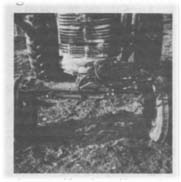 The power steering pump is powered by the same fan belt that drives the water pump. Greenlee's son Lynn mounted the power steering pump on the left side of the tractor, in line with the water pump, and installed a longer fan belt to drive both pumps. He also built a mounting bracket for the power steering pump's oil reservoir and bolted it to the tractor frame. He then attached a hydraulic steering cylinder to the steering arm by cutting off part of the steering arm. A control valve, also removed from the combine, attaches to the steering linkage. When Greenlee turns the steering wheel, the steering linkage opens and closes the control valve, which causes the steering cylinder to extend and retract to turn the wheels.