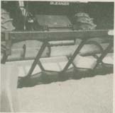 David Sauder, of LeRoy, built the "tire header" for his 1983 Gleaner F2 6-row combine. A series of 12 horizontally-mounted lawn mower wheels are used in place of the reel to gather plants in. The 16-in. tires are mounted horizontally just above the sicklebar. They're supported by a steel frame that mounts on the reel arms. The orbit motor and hydraulic system that normally drives the reel is used to rotate the center tire which in turn drives all of the other tires, with each pair of tires turning inward.