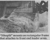 Developed in Sweden, the "Silosplit" knife mounts on a rectangular frame that attaches to front end loader arms in place of a bucket. The upper edge of the Silosplit is rounded so it can be used to pick up and transport bales and is also equipped with a second small stabilizer tine that keeps the bale from turning when handled.