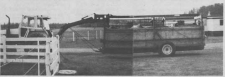 The trailer Graden used is a hydraulic-controlled rig that swings out to the side of the tractor and lowers to the ground to scoop up bales in it's bale-cradling arms, which are supported by overhead arches. "It works great for hauling cattle since it drops flat to the ground. No chute or ramp is needed and you can easily drag a sick or injured animal into the back of the box to transport it back to the farm," points out Graden, who uses the cattle box primarily to transport cattle to and from pasture. "It's particularly handy during calving season."