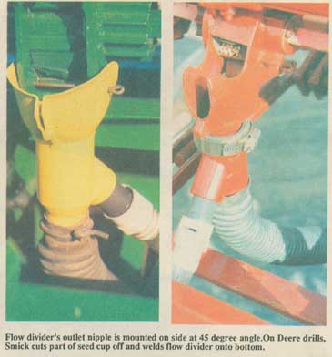 To install the flow divider, the drill's seed tube is removed from the bottom of the seed cup and the flow divider is then clamped or pinned onto the cup. The seed tube is then clamped onto the bottom of the flow divider. On Deere drills, Smick cuts part of the seed cup off and welds the flow divider onto the bottom.
