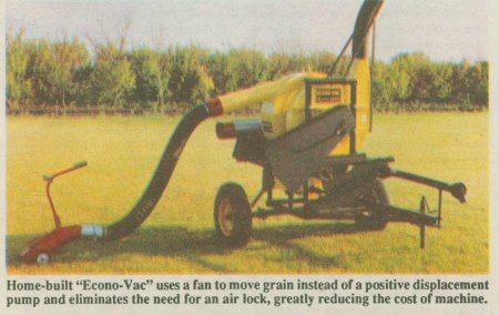 The "Econo-Vac", as Orosz calls it, uses a fan instead of a positive displacement pump and a transfer auger instead of an air lock. Grain is sucked up through a plastic hose fitted with a wheeled nozzle into a 3-ft. long steel pipe mounted on one side of the separator. The fan creates enough vacuum in the pipe to transfer as much as 2,000 bu. per hour. A transfer auger behind the fan delivers grain into the hopper of any conventional auger. Air from the fan exits through an exhaust pipe on top of the unit. The pto-operated unit requires only a 65 hp tractor.