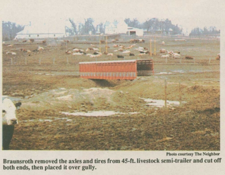 "It keeps cattle from having to walk through mud all the time to go across the gully," says Gilbert Braunsroth. "The trailer is 8 ft. wide but only 6 ft. high so a tractor won't fit through it. This is the second livestock semi-trailer we've used in this location. The other one lasted for 15 years."